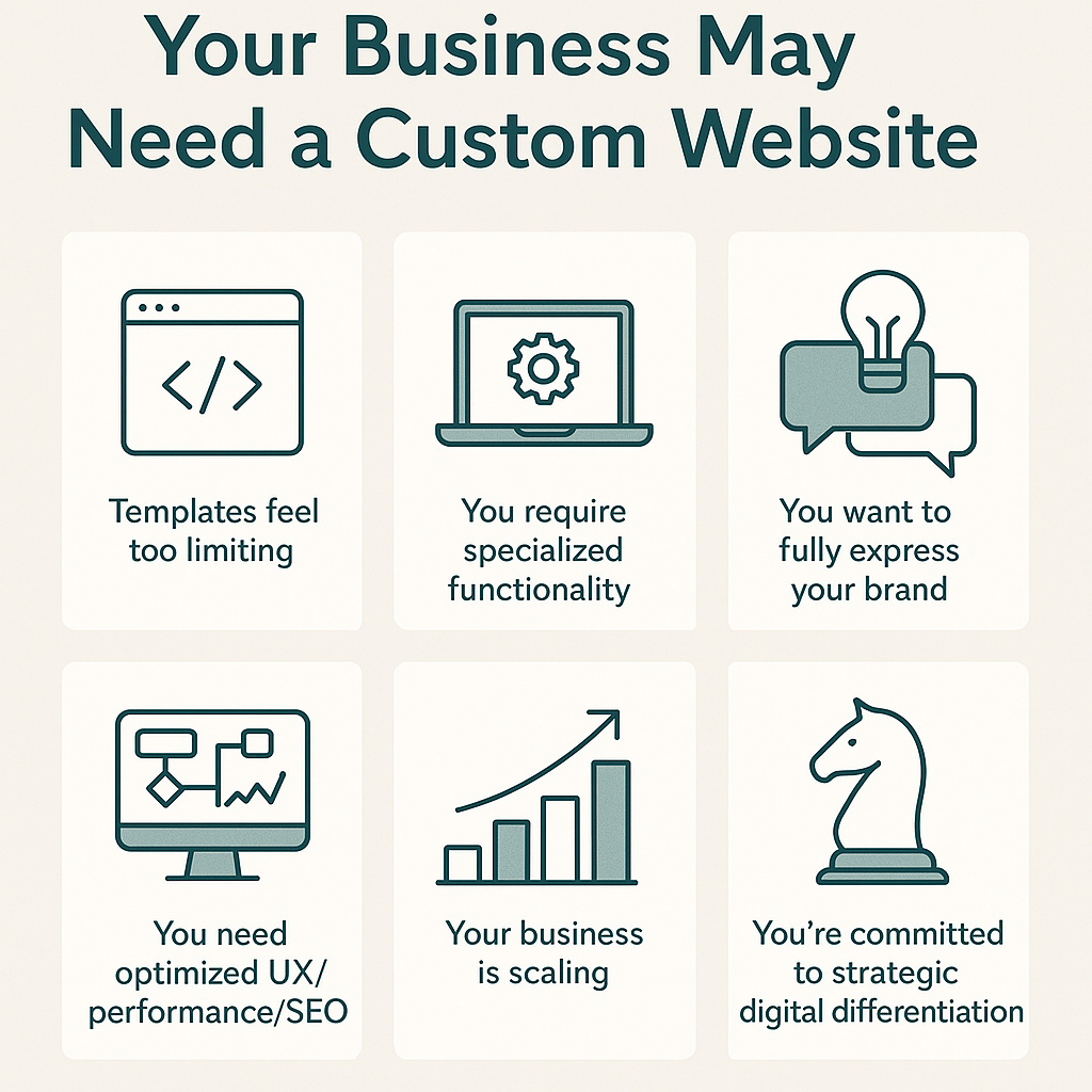 Your business may need a custom website if templates feel too limiting, you require specialized functionality, you want to fully express your brand, you need optimized UX/performance/SEO, your business is scaling, or you're committed to strategic digital differentiation.