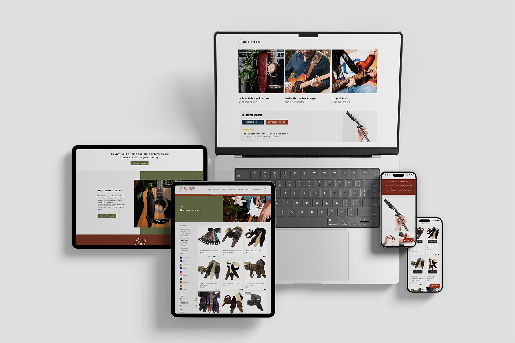 A three-tiered homepage design process gave Franklin Straps multiple visions to choose from, helping them combine favorite elements into a unified direction.